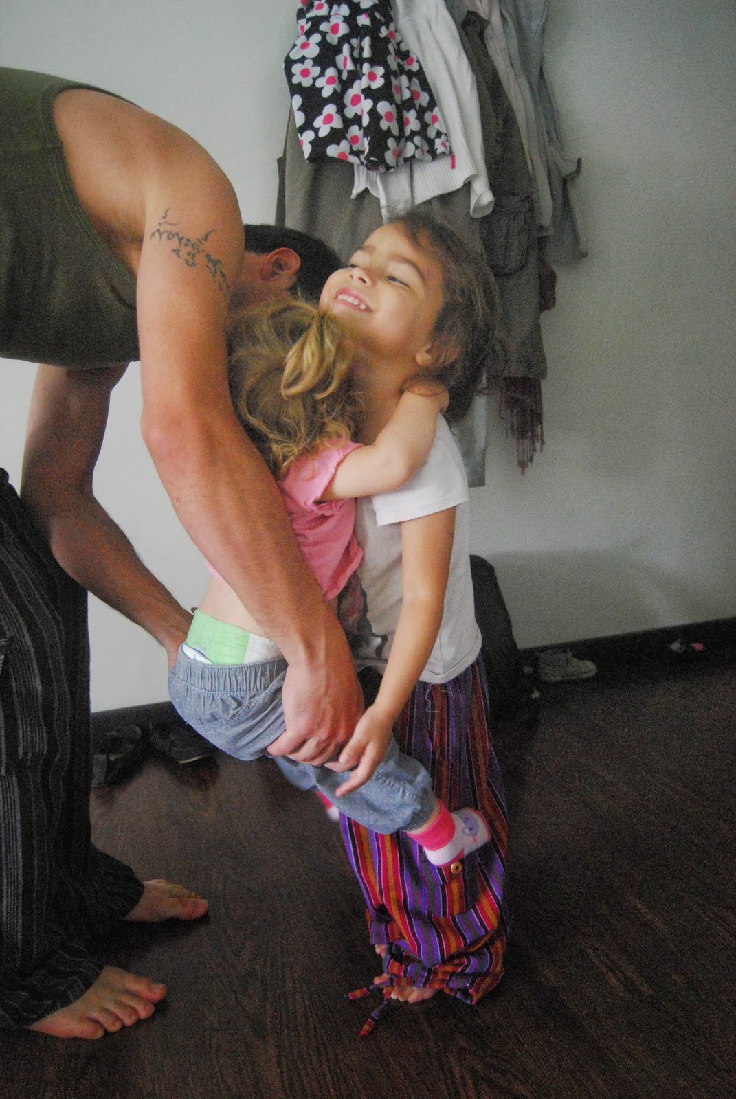Pas grave, puisque même si ce n'est pas très palpitant pour le blog les journées pyjamas, cela nous permet de passer du temps de qualité en famille, de jouer ensemble, de relaxer chacun de notre côté, de se coller ! Léa est vraiment très colleuse avec nous 3, il est évident qu'elle a du manquer d'affection et c'est un plaisir pour nous de la cajoler, de la chatouiller et de la bombarder de becs. Pas moyen de s'asseoir par terre sans qu'elle se précipite sur nous et dès qu'on se lève debout, elle nous tends les bras pour qu'on la prenne.